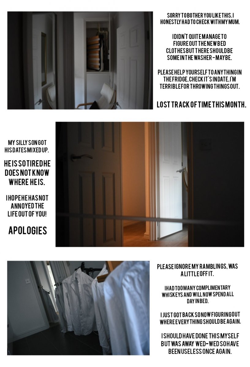 I want the work to feel complex without anyone having to know what it is about. I drew a lot of inspiration for creating this false identity from real encounters and experiences I had. I decided to give the reader an understanding of who this persona I created was and how they would be seen from a third party perspective. I took messages I still had and translated them into a voice that I felt fit with the character, the set and the situation I had created. I'm hoping that the decision the bring in the characters own voice, his mothers and the idea of them interacting with a third party will create an interesting narrative for the viewer then also being let in to this intimate and fictional dynamic.
